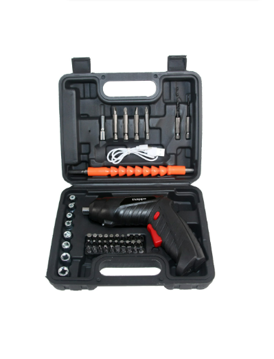 • Incluye: 8 Dados hexagonales (de 4 a 11mm), 4 Puntas de destomillador de 50mm, 30 Puntas de destornillador de 25mm, 2 Brocas HSS, 1 Porta puntas magnético, 1 eje de extensión flexible, Cable de carga micro USB a USB, Maletín de transporte y guardado.