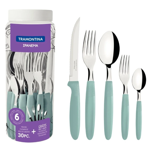 El set de cubiertos Tramontina Ipanema con recipiente de plástico de 30 piezas es la elección perfecta para acompañar tus comidas. Las piezas dan ese toque encantador a tu cocina y hacen más atractiva la cena, ya que cuentan con tiradores de polipropileno en elegante color verde. Las láminas están fabricadas en acero inoxidable y ofrecen mayor durabilidad debido al tratamiento térmico al que son sometidas. Es una cubertería súper práctica, ya que se puede usar en el lavavajillas y tiene un pote de plástico que se puede usar tanto para guardar cubiertos como para organizar tu cocina.