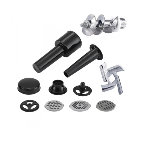 · Accesiorios incluidos: 3 discos/cuchillas de corte (fina, media, gruesa), accesorios para hacer embutidos (salchicha y kubbe), empujador de alimentos.