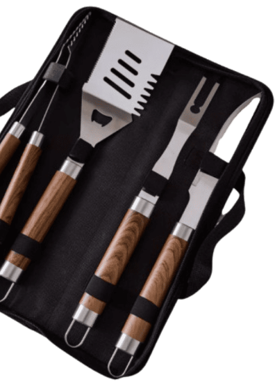 Set de utensilios para parrilla de 9 piezas en acero inoxidable con mangos de madera, incluye funda de transporte y ofrece resistencia, comodidad y practicidad para asados en casa o al aire libre.