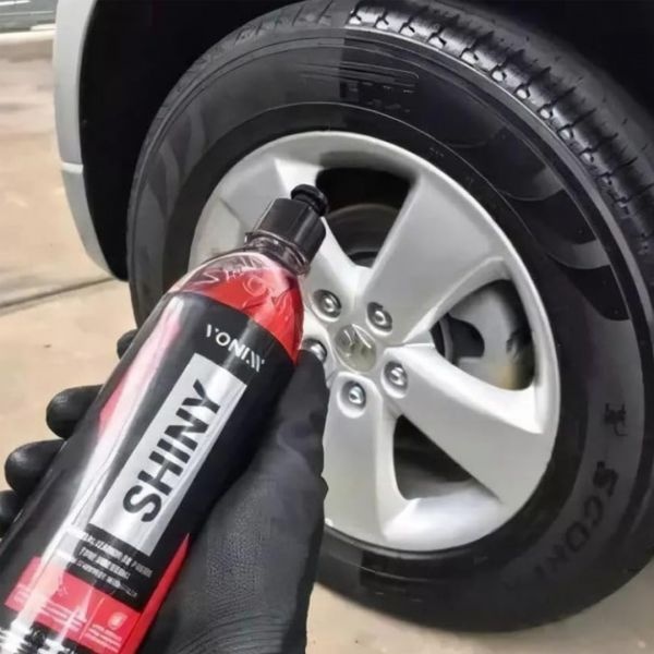 Shiny es un producto diseñado para renovar, proteger y brindar un brillo intenso a los neumáticos, garantizando un acabado uniforme y duradero. Su fórmula resistente al agua mantiene el efecto hasta por 60 días, conservando la apariencia de los neumáticos como nuevos y protegiéndolos contra el desgaste cotidiano.